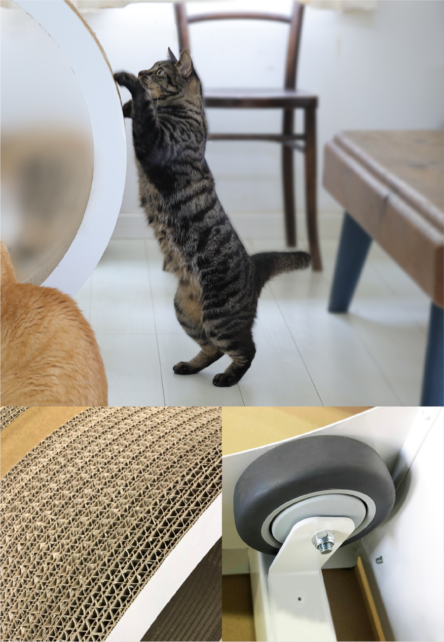 国産段ボールと国産鉄製のキャットホイール。お家の中で運動不足を解消!